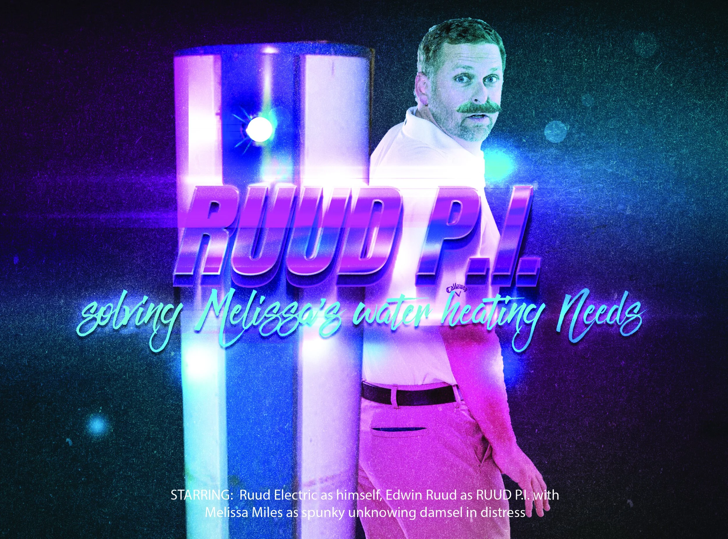 To highlight a Ruud water heating client having her unit since the 80s, The RUUD P.I. was a concept pitched to celebrate that longevity in a lighthearted manner and pulling inspiration from the 80s.